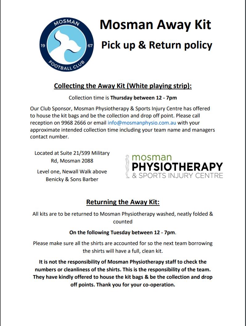 Our Club Sponsor, Mosman Physiotherapy & Sports Injury Centre has offered to house the kit bags and be the collection and drop off point. Please call reception on 9968 2666 or email info@mosmanphysio.com.au with your approximate intended collection time including your team name and managers contact number.