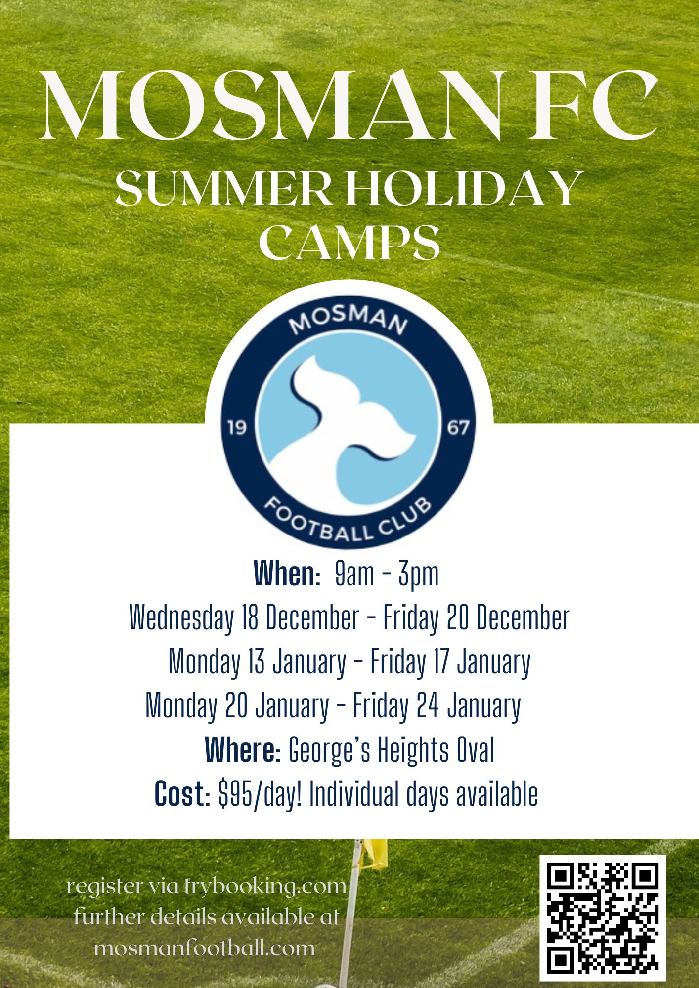Free up some time in this busy festive season and book the kids into Mosman Fc Summer Camp! Running 9am to 3pm at Georges Heights Oval, the days are filled with a variety of skills, drills and modified games with the Club Coaches.