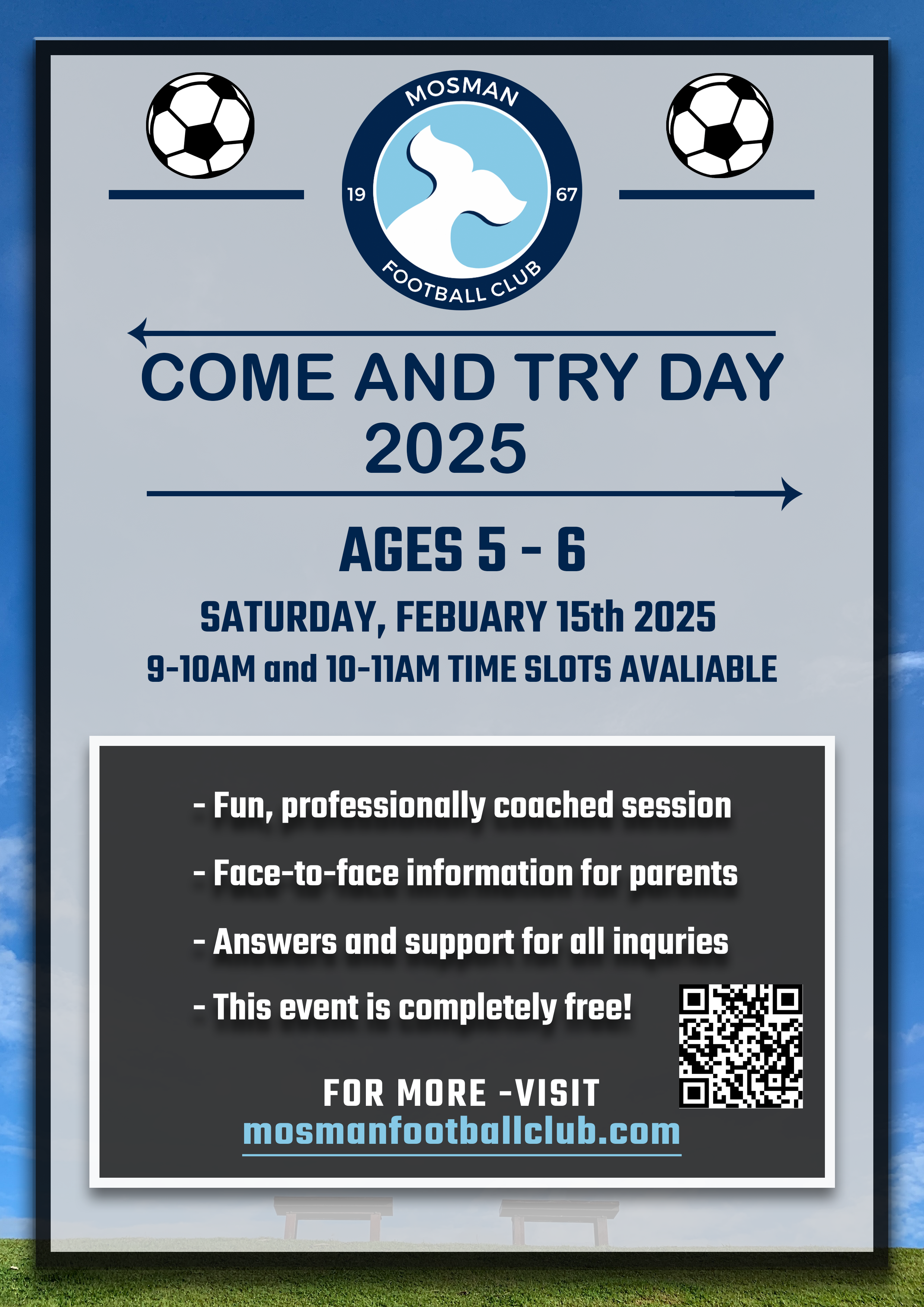 Mosman Football Club is pleased to be hosting a Come and Try Day for 5 and 6 year olds who are contemplating playing football (soccer) in 2025.